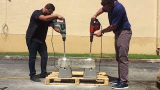 Comes with a Pick, Chisel and 2 drill bits between 12 and 20mm (also available wide chisel and other size drill bits up to 40mm on advanced notice) Deposit applies and damaged drill bits will be deducted Fastest Drill speed in its class - Up to 20% faster* Highest Demolition Performance in its class - Up to 40% high performance* Ultra low vibration due to Hitachi's original, spring-type dynamic vibration absorber & vibration absorbing side-handle - Approx. 15% lower vibration value* Hitachi's original, spring-type dynamic vibration absorber with a weight and two springs moves in the opposite direction to the vibration direction of the main body. This results in reduced vibration and improved operating efficiency. UVP5 Aluminium Housing Body (AHB) provides a super strong aluminium die-cast body with internal double-insulation making the housing more rigid, significantly enhancing durability of the motor unit. Improved handling with constant speed control & 4-stage electronic switching to adjust the drilling speed and impact rate push One-touch quick change SDS MAX chuck Large change lever & trigger switch - easy to operate wearing gloves 2-mode – Hammer only and Hammer Drilling Variable lock mechanism allows 12 different chisel angles (hammer only)