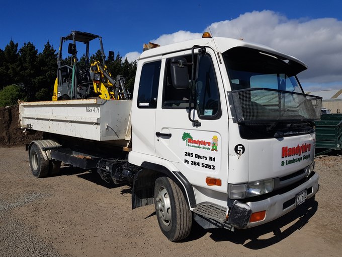 This truck has two decks or bins, that can be loaded completely off and on the truck. the decks or bins can also be hired on their own, we can drop it off empty so you can load or we can drop it off with products or earthworks equipment etc - Easier for smaller diggers and loaders as it is very low. - Swinging tailgate great for loading in and out of the bin, with barrows or mini dumpers and diggers. - Equipment can be transported on these decks as they have tie down points. - Landscape supplies can be delivered to site and while its being unloaded or loaded the truck can go and get more with the other bin.